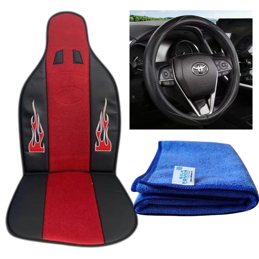🚗🔥 Car Seat Triple Combo – Key Features:- ✔️Complete 3-Piece Car Upgrade Set: Includes a flame-design seat padding cover, microfiber cleaning cloth, and universal steering wheel cover. ✔️Comfortable L-Shaped Seat Cushion Cover: Provides full back and bottom support for more relaxed, fatigue-free driving. ✔️Seat Protection & Durability: Protects car seats from wear, spills, stains, and daily use. ✔️Breathable & Heat-Reducing Material: Helps reduce sweating and heat buildup during long drives. ✔️Easy to Clean & Maintain: Simple clip-on design—unclip and wash whenever needed. ✔️Sporty Flame Embroidered Design: Adds a bold, stylish, performance-inspired look to your car interior. ✔️Multiple Color Options: Available in Red, Grey, and Blue to match your car’s style. ✔️High-Quality Microfiber Cleaning Cloth: Safely removes dust, fingerprints, and smudges without scratching surfaces. ✔️Universal Steering Wheel Cover: Enhances grip, comfort, and control while driving. ✔️Steering Wheel Protection: Shields against wear, heat, fading, and daily handling. ✔️Universal Fit Design: Suitable for most cars and easy to install. ✔️All-in-One Interior Refresh: Instantly upgrades comfort, protection, and style in one value combo.