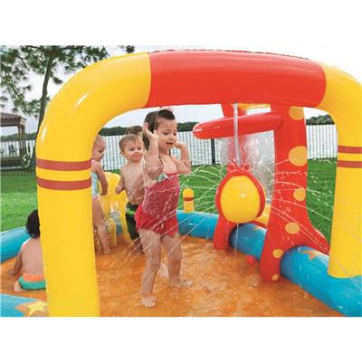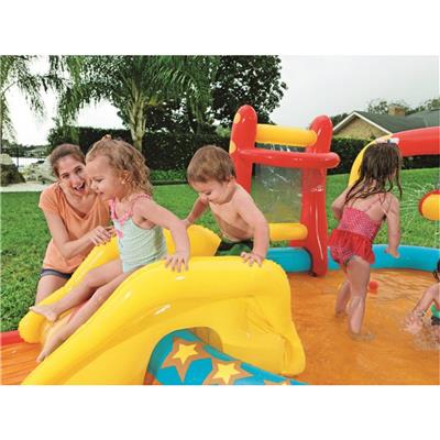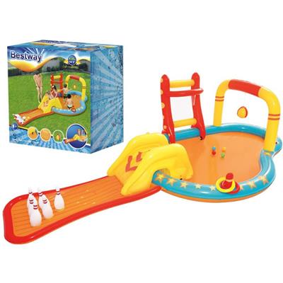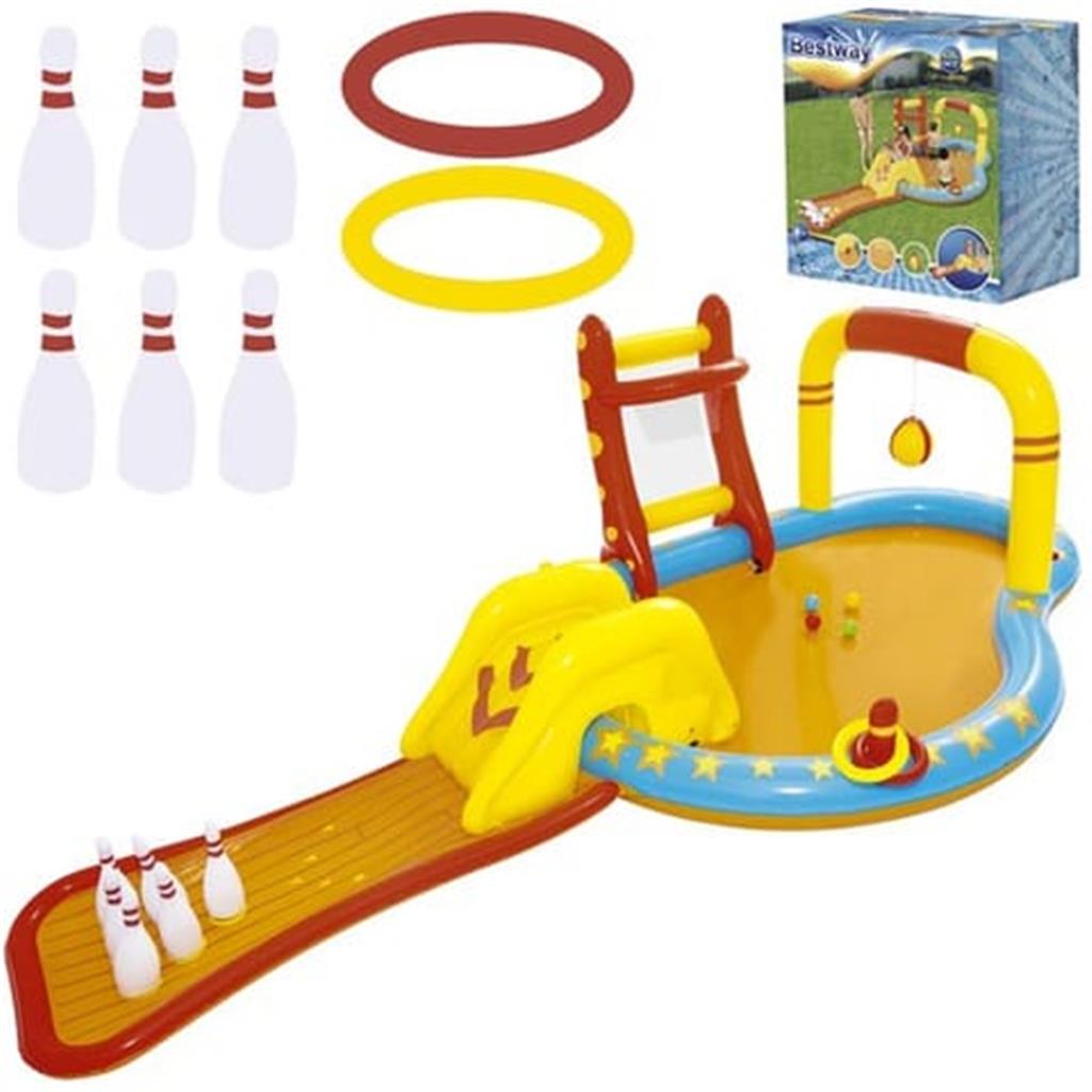 Bestway Lil’ Champ Water Play Pool Centre Playground Inflatable Splash Park Sprayer Bowling Basketball Ring Outdoor Activity Waterplay With FREE kids goggles. MAKE THIS SUMMER UNFORGETTABLE WITH THE ULTIMATE WATER PLAY CENTER! 🏀 Shoot hoops with the built-in basketball ring! 🎳 Strike a win with inflatable bowling! 🎯 Try your luck with ring toss games! 💦 SLIDE & SPLASH! A mini water slide leads right into the pool!