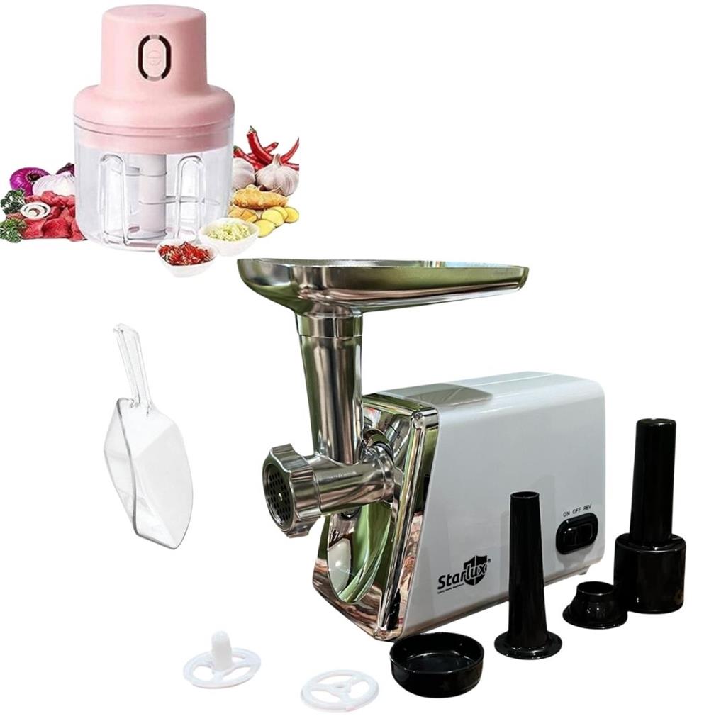 Starlux 2500W Heavy Duty Electric Meat Grinder + FREE Mini USB Chopper 2500W Heavy-Duty Motor – Grinds up to 2 lbs of meat per minute. Versatile Grinding Plates – Coarse, medium, fine; plus sausage tubes & kubbe attachment. One-Touch Operation – ON/OFF/Reverse for easy and safe use. Durable Stainless Steel – Hygienic, easy to clean, built to last. Perfect for Trini Recipes – Pastelles, minced pies, shepherd’s pie, mini pies, and appetizers. Multi-Functional – Grind, stuff, and season all in one machine. Time-Saving – Quick prep for large holiday feasts. Safety First – Overload protection prevents motor strain and clogging. Holiday Ready – Make traditional Trini dishes effortless and flavorful.